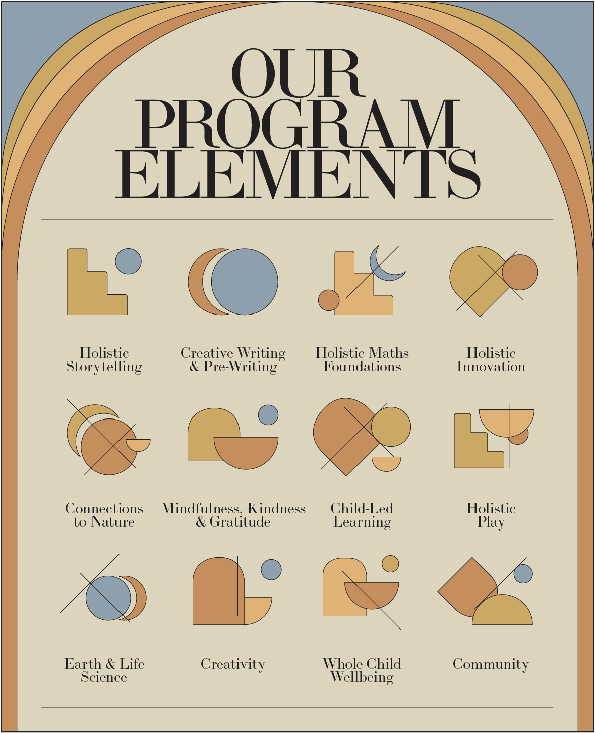 Each experience inside the program is linked to these elements for a unique yet comprehensive holistic approach. Extensive early childhood research & experience has been used to create these program elements that offer a simple & cohesive way to navigate our online programs.